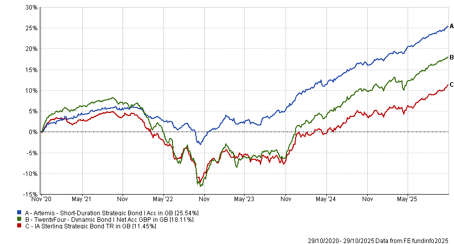 Both funds have an FE fundinfo Crown rating of five out of five. However, the £636.3m Artemis fund has outperformed the £1.7bn TwentyFour fund over five years, gaining 25.5% versus 18.2%.