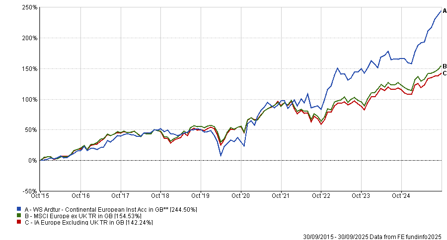 Another outperforming active fund option is the WS Ardtur Continental European fund.
