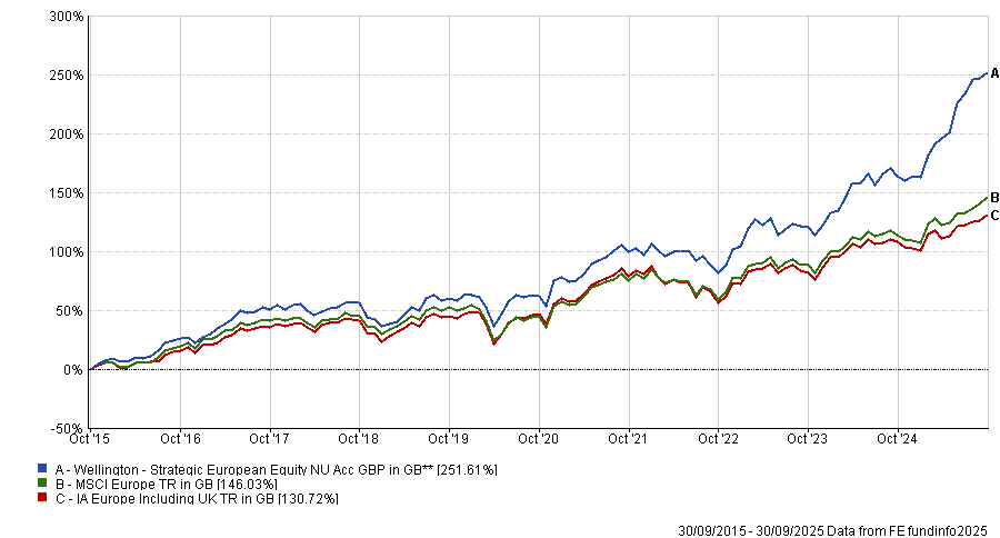For example, the Wellington Strategic European Equity fund has ranked in the top-quartile of the IA Europe including UK sector over the past one, three, five and 10 years.