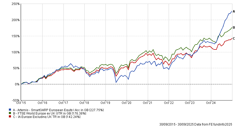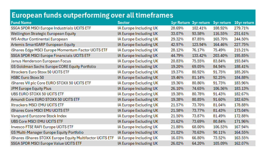 Indeed, 22 funds across the IA Europe ex UK and IA UK Europe including UK sectors have delivered top returns over the past one, three, five and 10 years, with 15 of them being trackers or exchange-traded funds (ETFs).